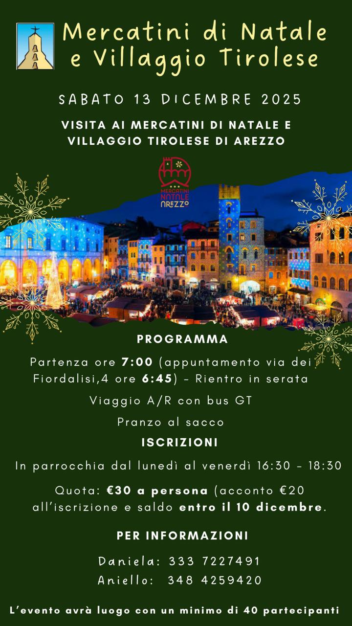 ![]() | GITA PARROCCHIALE Sabato 13 dicembre 2025 visita ai Mercatini di Natale e villaggio Tirolese ad Arezzo. Iscrizioni in parrocchia dal lunedì al venerdì dalle ore 16.30 alle 18.30. Quota 30€. Ulteriori dettagli e informazioni nella locandina |