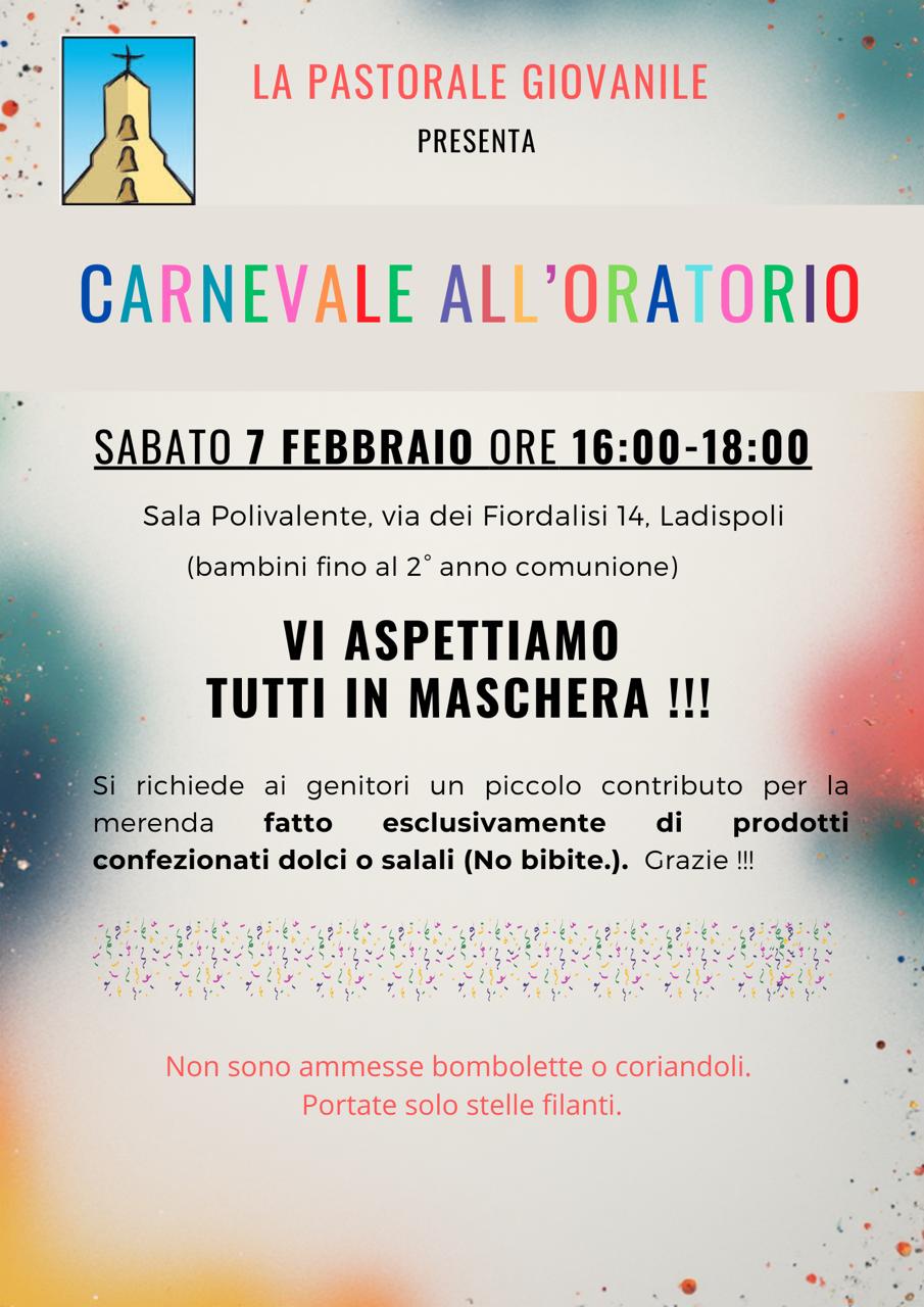![]() | CARNEVALE IN ORATORIO Sabato 7 febbraio 2026, ore 16.00-18:00 nella sala polivalente parrocchiale - via dei Fiordalisi 14- bambini (fino al 2° anno comunione) Per i dettagli e info vedi la Locandina |