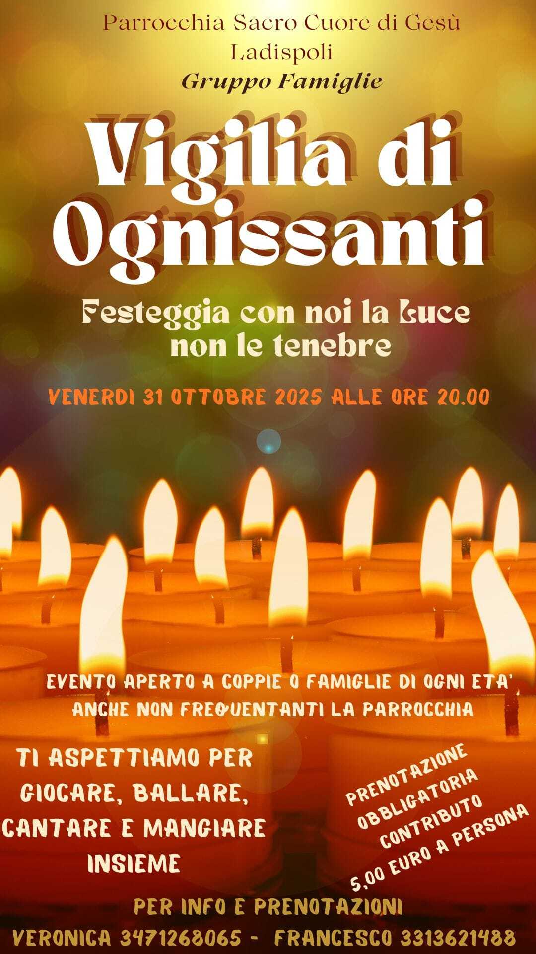 ![]() | FESTA DELLA LUCE La vigilia di Ognissanti scegli la luce e non le tenebre... Il Gruppo Famiglie ti aspetta il giorno di Venerdi 31 ottobre ore 20.00 presso la Parrocchia Sacro Cuore di Gesù - Ladispoli via fiordalisi 14. Ingresso aperte a tutte le famiglie. |