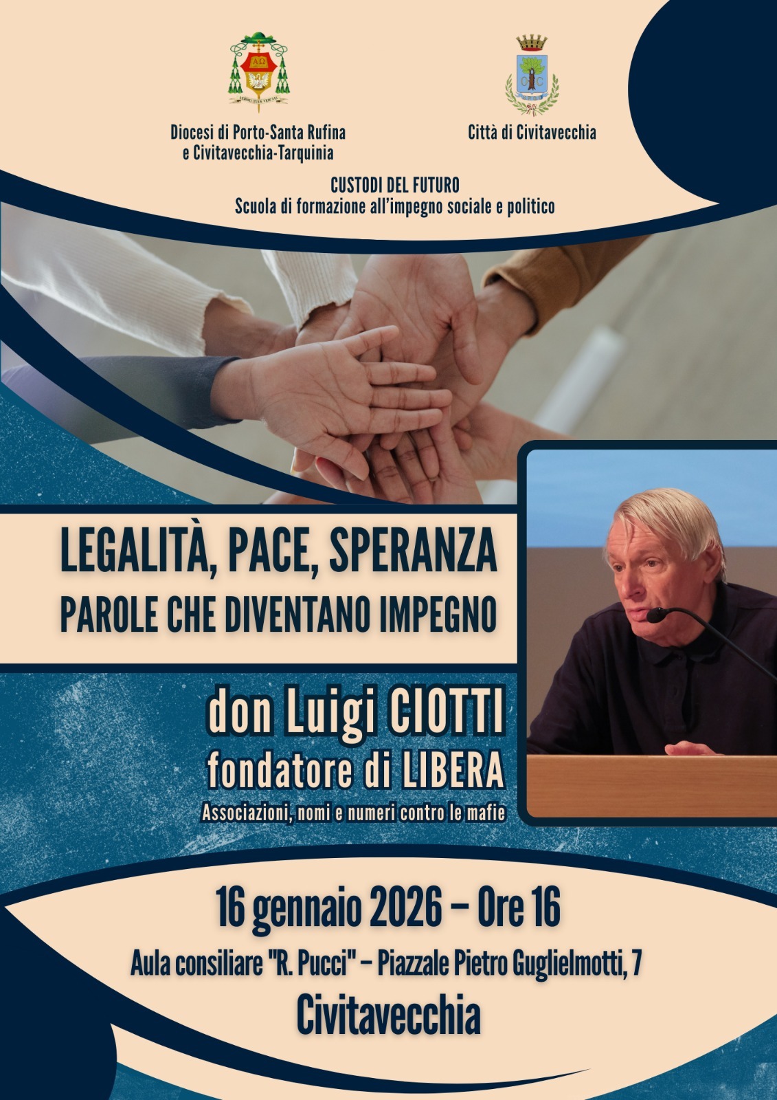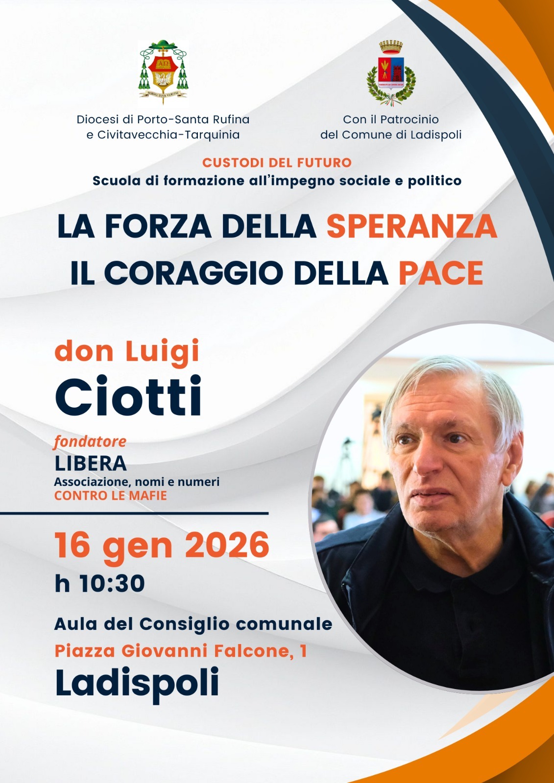 ![]() | LEGALITA' E PACE Venerdì 16 gennaio ore 10.30 aula consiliare di Ladispoli e ore 16.00 aula consiliare di Civitavecchia incontro con don Luigi Ciotti fondatore di Libera (contro le mafie). Dettagli nella locandina: Ladispoli e Civitavecchia |