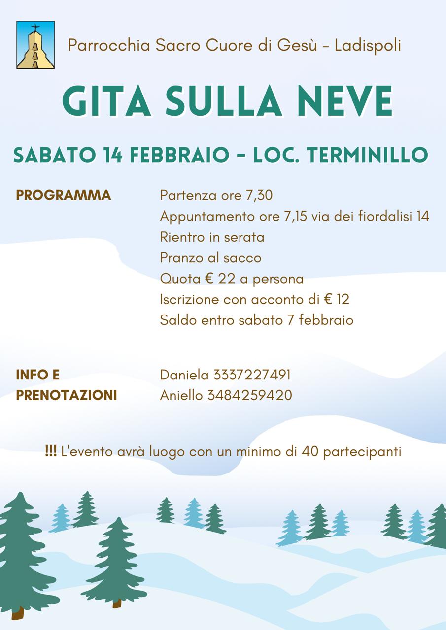 ![]() | GITA SULLA NEVE Sabato 14 febbraio 2026 gita al Terminillo. Appuntamento 7.15 via Fiordalisi 14. Prenotazioni aperte fino al 7 febbraio in Ufficio parrocchiale. |