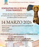 ASSISI - SPOGLIE DI SAN FRANCESCO Sabato 14 marzo 2026 partenza ore 5.45 via dei Fiordalisi 14, visita ad Assisi per la Venerazione delle spoglie di S. Francesco a 800 anni dalla sua morte. Prenotazione entro il 7 febbraio in Ufficio parrocchiale. | |