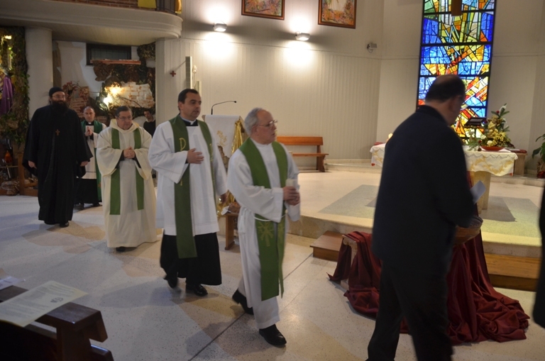 La liturgia ecumenica si è svolta in diversi momenti celebrativi: dopo un’introduzione i sacerdoti entrando in chiesa hanno versato ciascuno una brocca d’acqua nel catino che rappresentava simbolicamente il pozzo della samaritana, aprendo così al tema della serata: “Dammi un po’ d’acqua da bere” (Gv 4,7). L’acqua versata insieme ha significato l’unità dei battezzati, che è reale, sebbene ancora incompleta. Dopo il rito penitenziale e l’ascolto del capitolo 4 del vangelo di Giovanni, c’è stata una meditazione condivisa con il contributo di quattro concelebranti; P.Lucian Birzu, don George Woodall, don Italo Colombini e don Giuseppe. Prendendo il medesimo tema da varie angolature, essi hanno messo in risalto l’importanza del battesimo e dell’acqua viva dello Spirito Santo che Gesù dona ai suoi discepoli per essergli testimoni credibili nel cammino verso l’unità, anche in questo tempo pieno di difficoltà e di paure.Un’unità resa necessaria, oltre tutto, dall’opposizione frontale alle Chiese del mondo miscredente e senza Dio.