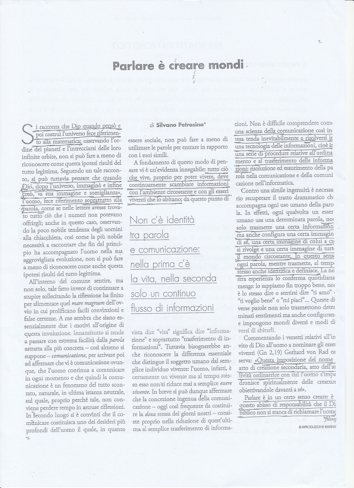 Si sentono ripetutamente critiche dell’avversario, denunce della sua incapacità e non pensieri propositivi, ragionamenti capaci di assumere il buono che la diversità dell’altro presenta; dobbiamo imparare a leggere quel che accade non in modo avversativo o fermandoci ad una lettura superficiale. Oggi il rapporto con il mondo è soprattutto una questione di linguaggio, di immaginario; prevalgono le leadership non razionali ma carismatiche, che fanno intuire orizzonti e così impariamo a parlare secondo il nostro guru di riferimento, e usiamo lo stesso linguaggio, la stessa espressività di parole, divisive, demonizzanti, distruttive dell’altro. Spesso il nostro linguaggio di oggi è ambiguo, fatto di fake, mentre cresce il bisogno di parole vere e questa cosa, di centrarci sulla Parola di Dio è oggi la missione più necessaria, senza la quale l’uomo vivrà confuso. Noi dobbiamo inventare linguaggi, essere capaci di usare parole “altre” da quelle che il mondo propone per fare i suoi giochi di dominio, essere capaci di costumi “altri”, quelli che la Chiesa chiama “le buone pratiche”. Come credenti e come cattolici siamo chiamati a contribuire alla costruzione di un mondo diverso e migliore secondo la nostra cultura, che già ci dà di essere luce e lievito.