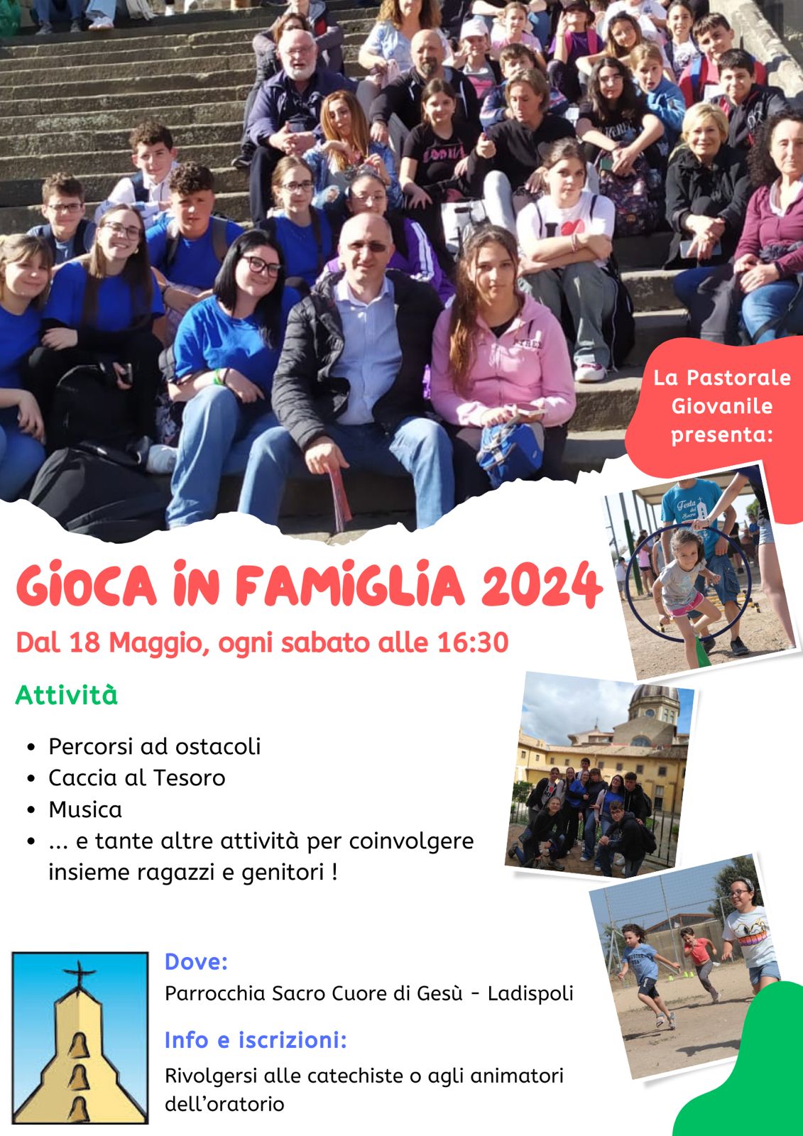 ![]() | GIOCA IN FAMIGLIA 2024 Dal 18 Maggio ogni Sabato alle ore 16.30 la Pastorale Giovanile della nostra parrocchia organizza attività rivolte a tutti i ragazzi che vogliono trascorrere un momento all'insegna dello sport e del divertimento. | |